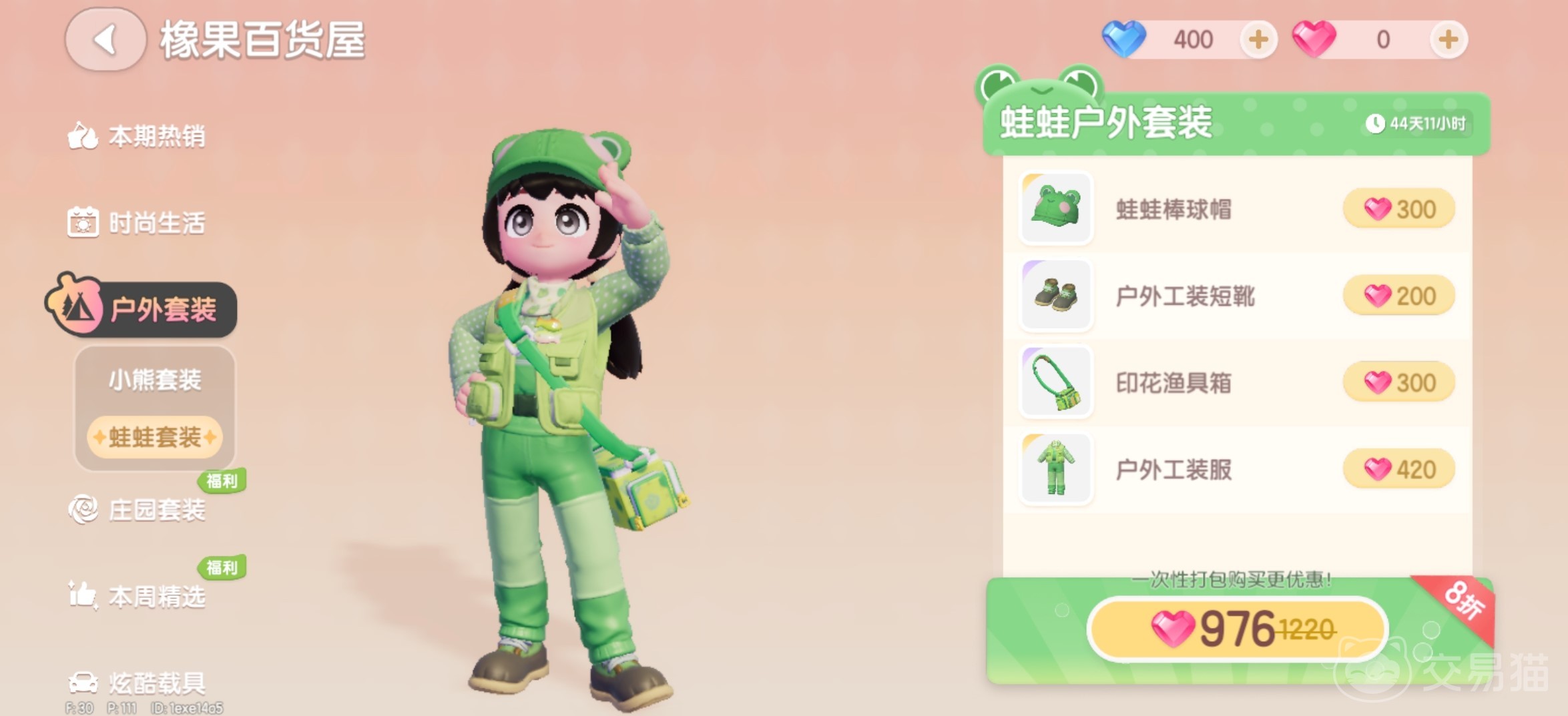 而另一种户外套装则是蛙蛙套装,我们听到这个套装的名字便可以联想到它是绿色的,这个套装的衣服样式和小熊套装相类似,只是将小熊套装的粉色变成了绿色,同时它将小熊套装的小熊帽子改成了青蛙帽子,使得套装整体看上去更有活力。虽然橡果百货屋现在暂时只有两套户外套装,但是游戏毕竟刚推出,接下来肯定会出更多的款式的户外套装的。同时刚刚提到的小熊套装和蛙蛙套装是限时销售的,感兴趣的小伙伴可得赶紧下手了。