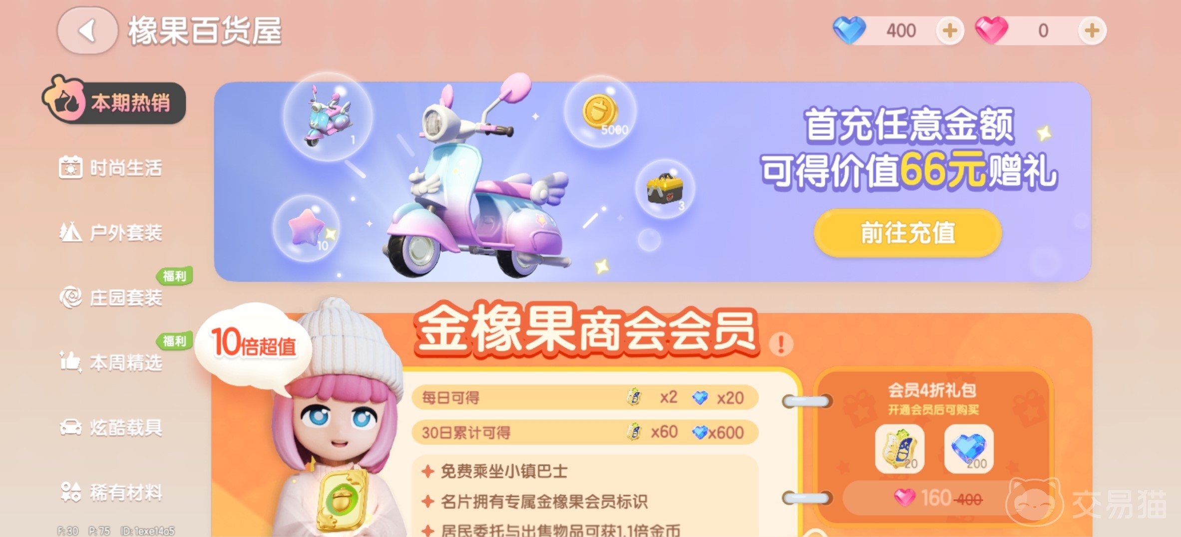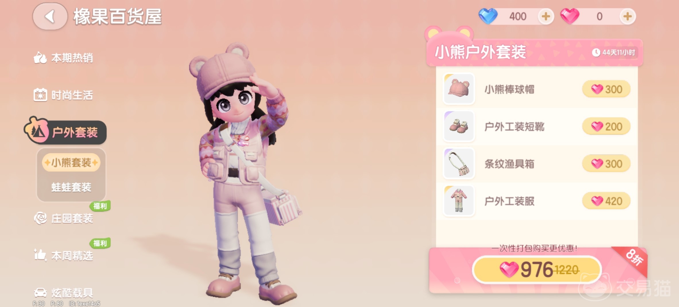 打开橡果百货屋,我们就会看到左侧有个户外套装,点击进去就是我们要买的户外套装了。现在商店中的户外套装有两款,一款是小熊套装,小熊套装以粉丝作为主色调,整体的服装偏工装风,很符合户外套装这一特点,加上一个小熊形状的棒球帽点缀,整体是很好看的。