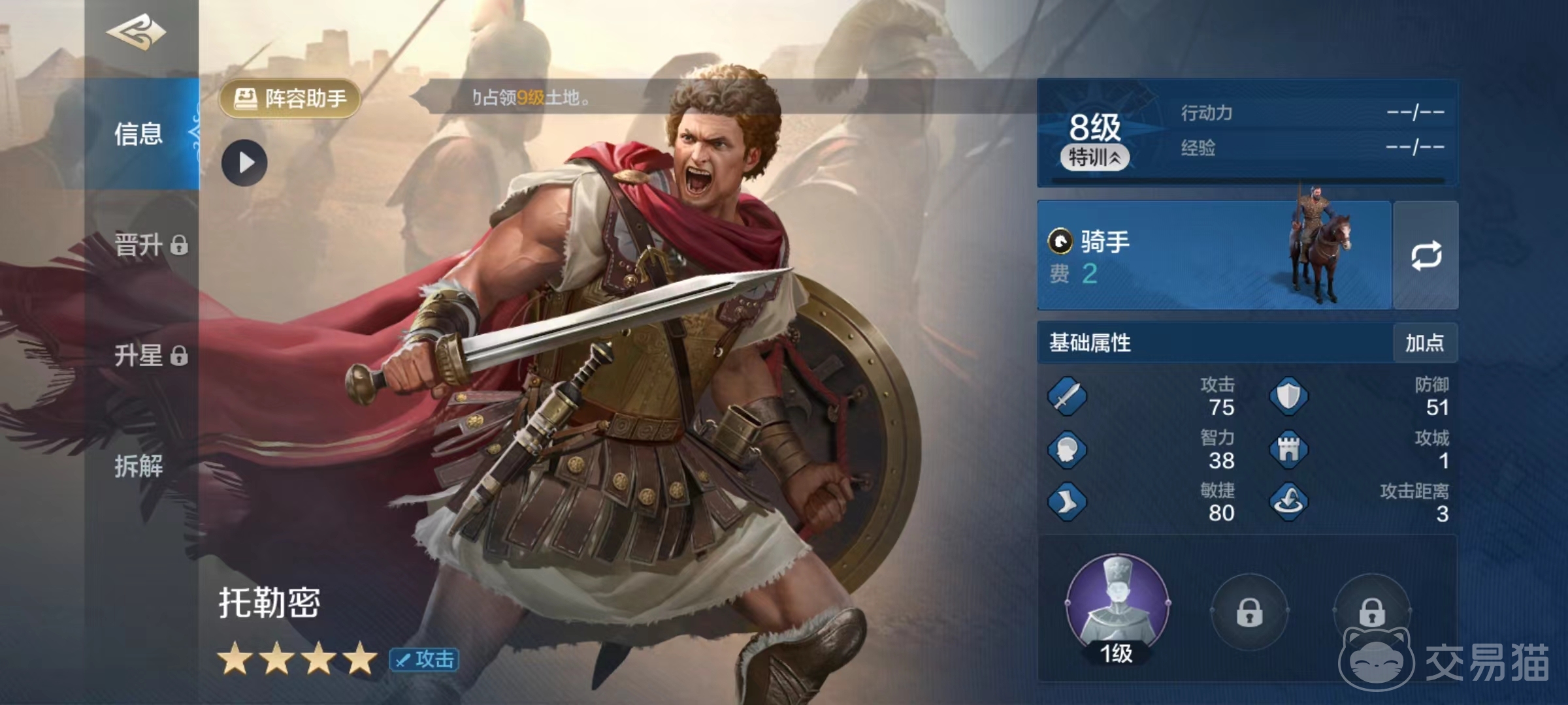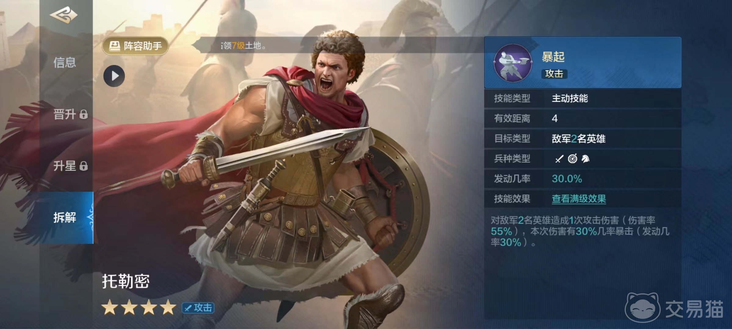当然全部由四星级武将组成的阵容强度肯定会低一些,但胜在容易成型培养比较简单,这样升星达到高星级后,也可以具有一定的实力。如果大家对这一套流派不感兴趣,托勒密也可以发挥自己的最后作用,那就是被分解掉贡献出一个技能。托勒密所分解出来的是爆起,属于主动技能类型,对敌方两名英雄造成一次攻击伤害,另外本次伤害有30%的几率暴击。