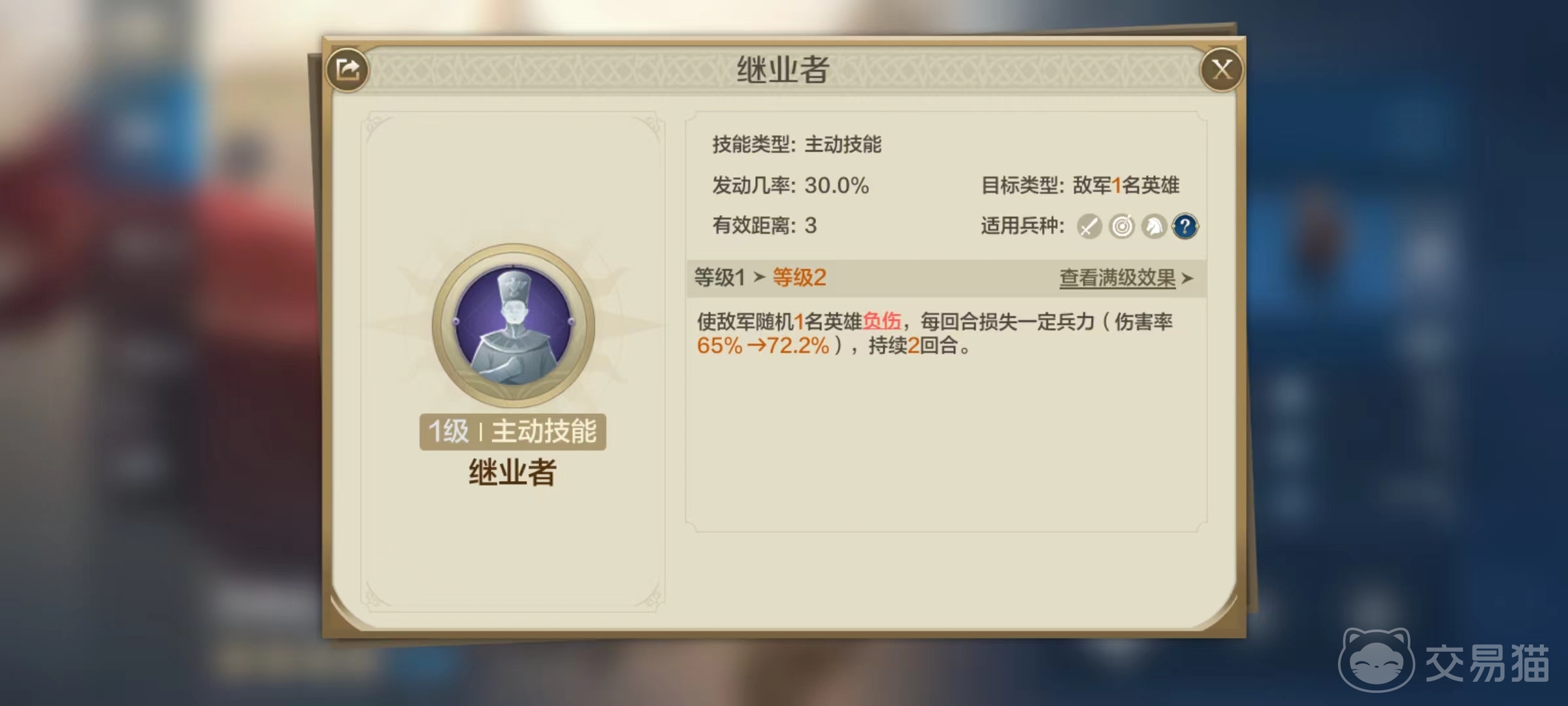 托勒密所自带的主动技能继业者,有30%发动几率,使一名随机敌方英雄受伤,每回合损失一定的兵力,持续两回合。受伤是属于一种减益效果,对方在持续回合内,将在每回合个人行动时都会生效,受到攻击伤害。在四星级武将中,还有一个属于同样的效果,那就是彼得大帝,彼得大帝也比较适合与托勒密一起搭配起来。