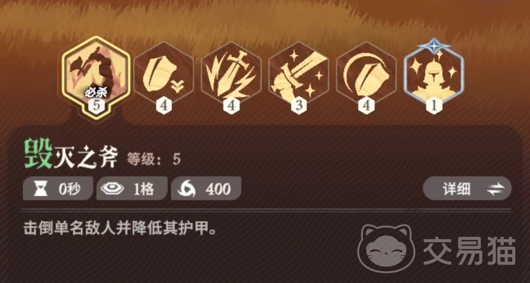 必杀技是毁灭之斧,对一名敌人进行强力斩击,将目标击倒并造成高额伤害,同时施加三层碎甲效果,每一层都能降低目标10%护甲值,目标最多叠加4层。提升等级后,当大熊在场上的时候,有友军降低敌方单位护甲,那么大熊还会施加额外的一层碎甲。这样在搭配的时候尽量选择能够降低对方单位护甲的友军,可以快速将碎甲叠加到满层增加伤害。该技能提升等级其他效果不变,只能略微提升伤害。