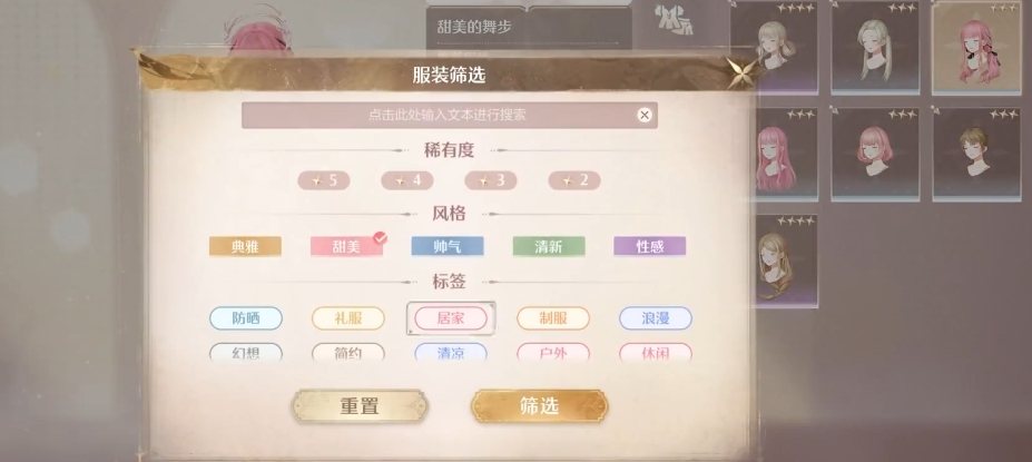 而10大标签又分别是防晒、礼服、居家、制服、浪漫、幻想、简约、清凉、户外、休闲。如果玩家想要自己的游戏变得更加简单轻便,我们可以先给不同的服饰进行筛选标签,之后再进行搭配的时候,直接选择对应的标签就会出现里面所有的服饰,搭配也会更加顺利一些。