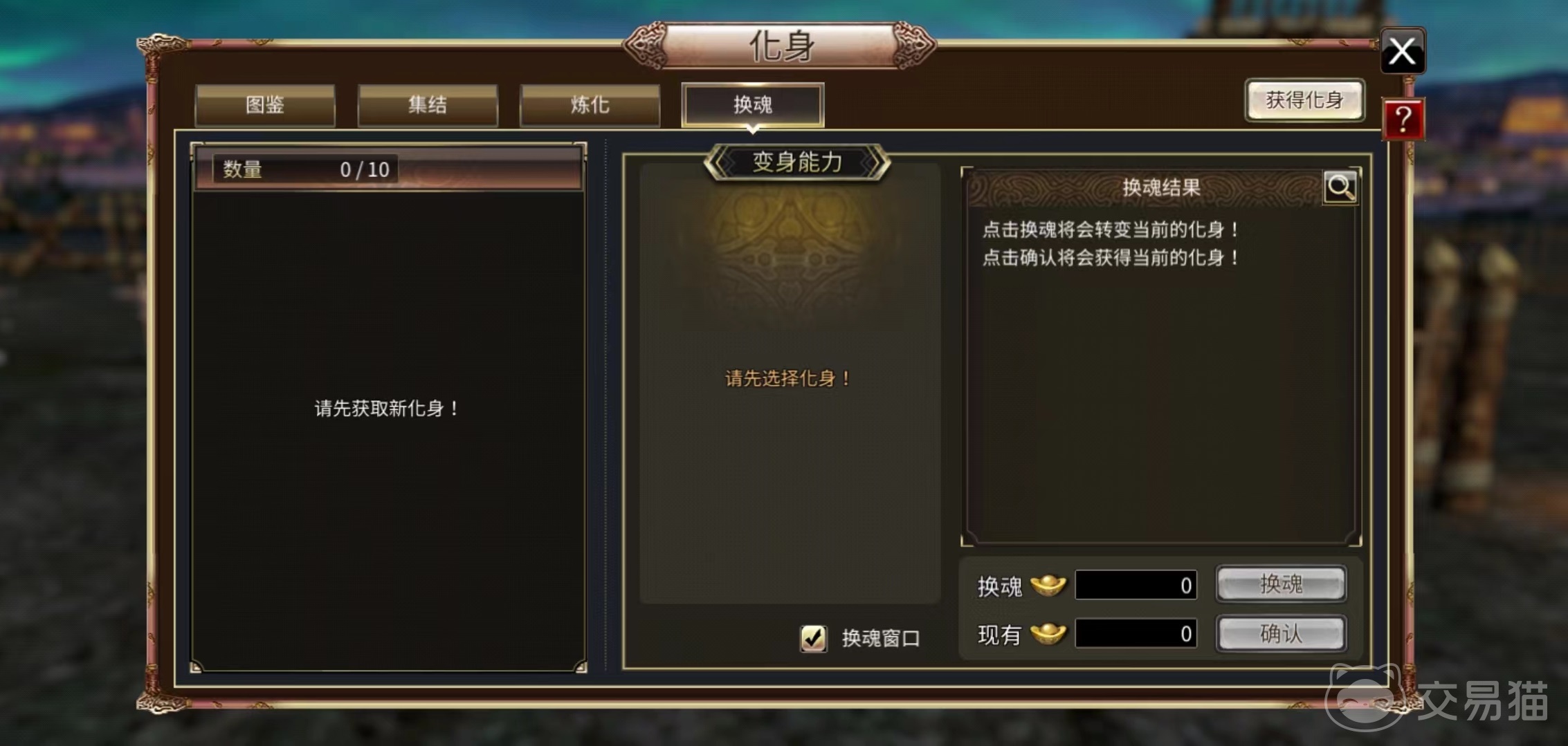 大家首先在主页面中点击化身,然后可以看到其中的换魂功能。换魂列表显示的化身,获得会先收到换魂匣中,获取的途径包括活动元宝抽取、九周化身录、炼化或者是使用换魂卡等。在换魂功能的换魂匣中最多可以保留10个化身,达到数量上限后就不能重新获得。换魂品阶化身已经全部解锁,获得不会进入换魂匣,直接转换成相应的幻符。