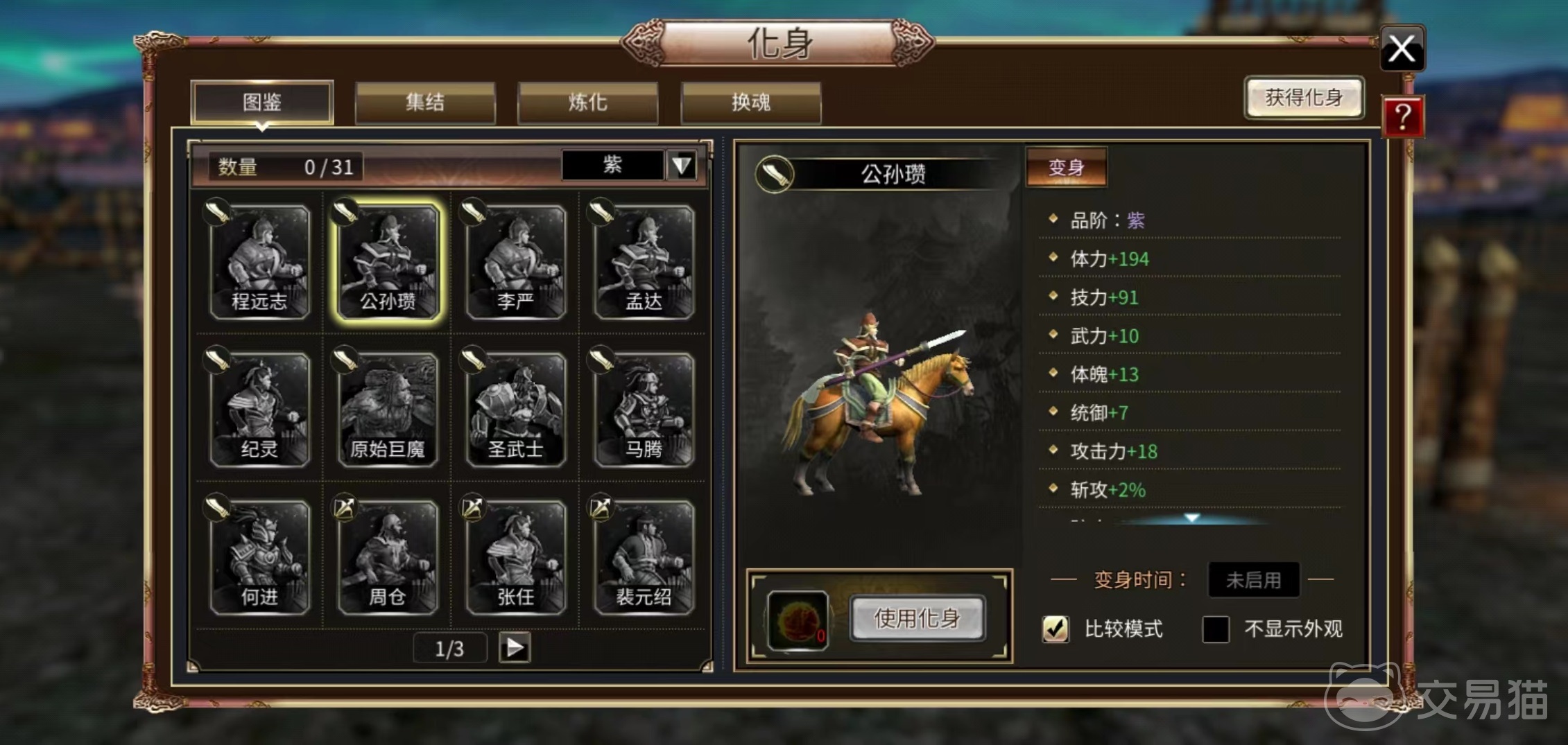 简单来说,使用的方法就是点击换魂,将会转变当前的化身,然后点击确认,会获得当前的化身,只是获取过程需要大家多多努力。换魂列表中的武将比较多,包括周仓、公孙瓒、孟达、刘表、苏飞、黄祖等,有非常多的选项,他们的概率都是3.22%。不同化身都有不同的能力,具体该选择哪一个就要看自己当前的职业和其他的需求来确定。