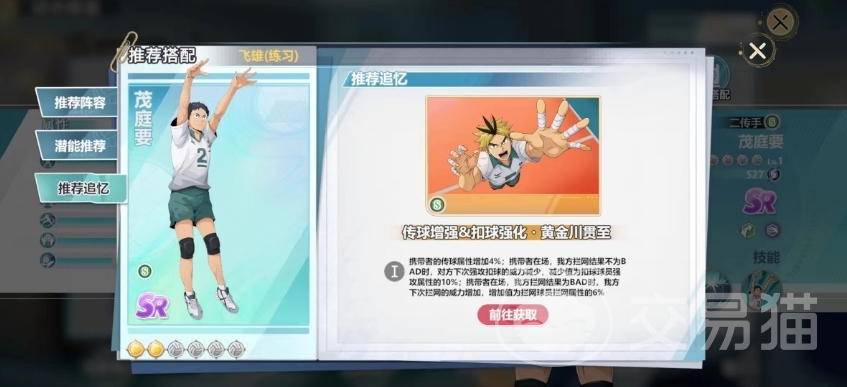 传球增强和扣球强化是他适合的追忆效果,首先茂庭要的传球属性将直接增加4%,当茂庭要在场时,如果他方拦网结果不是AD,对方下一次的强攻扣球威力将会减少。