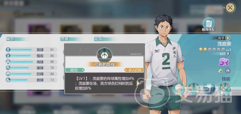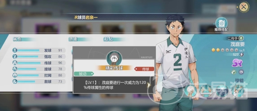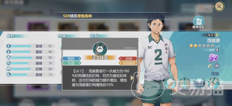 茂庭要是游戏中sr级别的二传手,整体的效果比较多,所以大家使用起来也有多种选择,他的传球技能尤为出色,第一个被动技能精彩传球,触发的时候可以让他的传球属性增强至120%,这为队伍提供了强大的进攻支持。