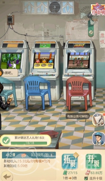 在解锁了小卖部之后就能解锁【游戏厅】了,游戏厅内能放置多少台游戏机以及游戏机内能有多个个小游戏,需要玩家靠经营其他产业来获得扩展道具,有了扩展道具后能增加游戏机数量和游戏内容。当顽疾资金积累到一定程度后还能开启【网吧】产业。