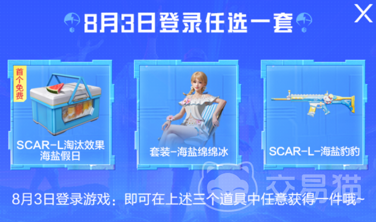 接下来就是玩家们最期待的皮肤和时装奖励了。我们只需要在8月3日这天登录游戏,便可以从图上所示的三个皮肤中的其中一个。值得一提的是,这个淘汰效果是和平精英第一个免费的淘汰特效,对于零充玩家来说,肯定是要领取一个的。因为和平精英之前的淘汰特效如果没充钱一般是拿不到的。除了上述几个活动外,还有时装限时免费的活动,限免的时装品质都是很高的,感兴趣的小伙伴到时候上线游戏试试看。