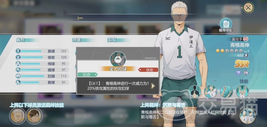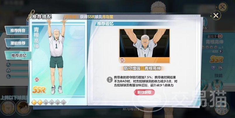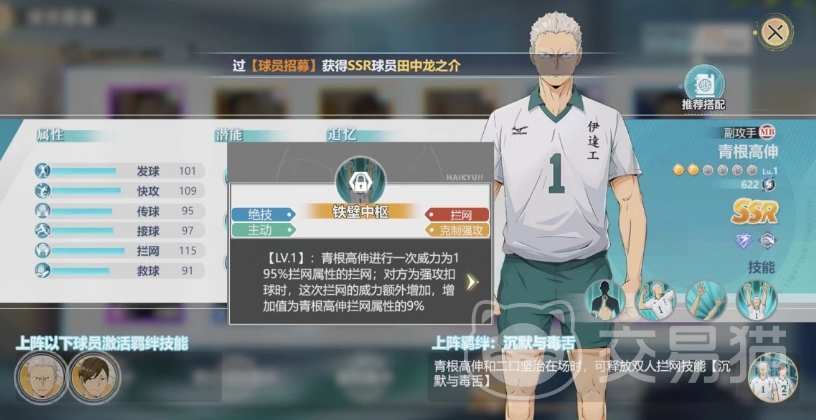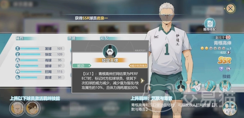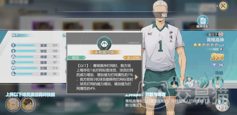 阵容上面可以选择搭配二口坚治、黄金川贯至,小原丰以及笹谷武仁 这样的搭配,上阵羁绊是沉默与毒舌,可以在跟二口坚治一起上场的时候触发,羁绊效果是青根高伸和二口坚治在场时,可释放双人拦网技能沉默与毒舌,追忆可以选择使用防守增强。
