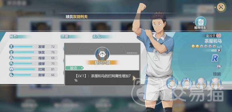 最后一个是主动技能,效果就是努力拦网,作为茶屋和马的绝技,努力拦网是他身上威力最大的主动技能,威力达到了175%的拦网属性,这一技能的释放往往能够改变比赛的局势,尤其是在对手发起强力进攻时,茶屋和马的这一技能能够成为团队防守的关键,所以大家只能寻找最佳的释放时机。