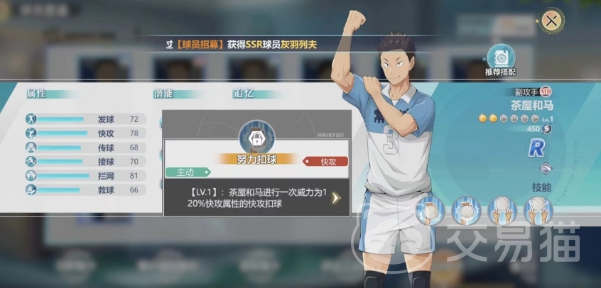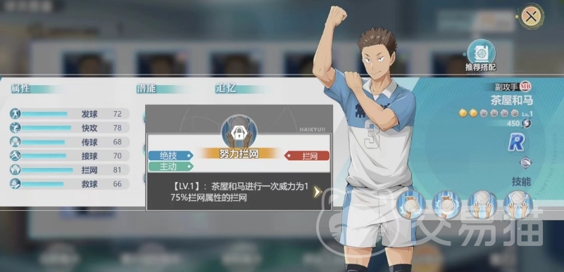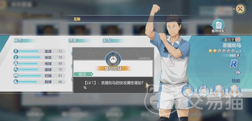 他作为一个副攻手,虽然品质只有R级,但是前期球队还是适用的,被动技能一是基础扣球,这项技能为茶屋和马提供了一个稳定的基础,使得其快攻属性得到7%的提升,这不仅增强了茶屋和马在场上的进攻能力,同时也为团队带来了更多的选择,在实际比赛中,玩家可以充分利用这一属性加成,通过快速的进攻节奏打乱对手的防守布局,主动技能是带来努力扣球的效果。