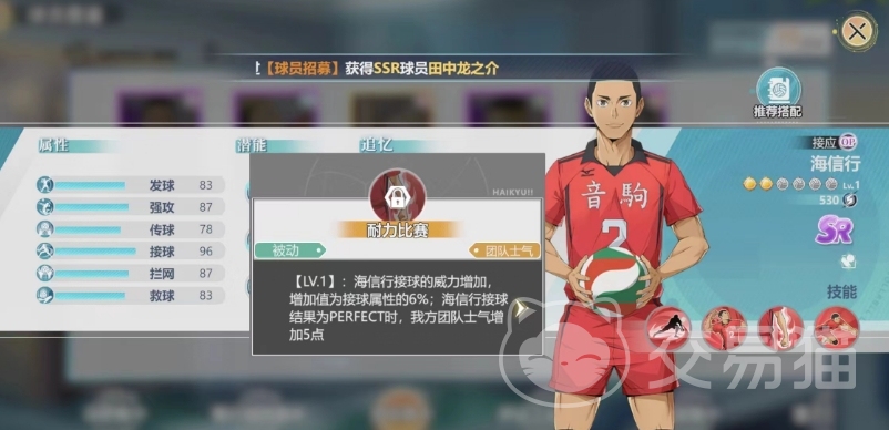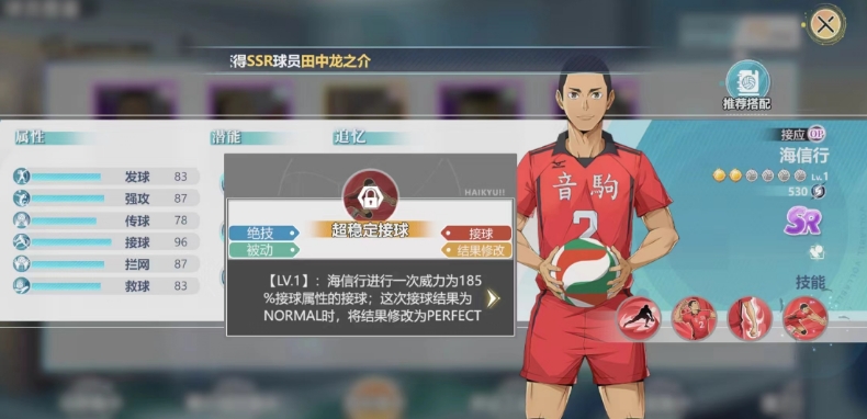 其实海信行的角色设计强调了接球与团队士气的重要性,大家可以通过他的技能组合,带来更多的接球战术,优化整体的发球效果,并提升团队的实力以及对球的表现,海信行的耐力比赛同样是一项被动技能,当他接球时,该技能提供额外的威力增幅,增幅值为接球属性的6%,当接球结果达到完美级别时,此技能还能为团队士气增加5点,这鼓励玩家在保持高接球成功率的同时,也注重团队士气的积累,为持久战做好前期的准备。