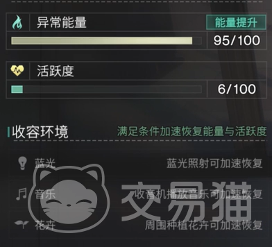 捕梦网的收容环境激活越多,活跃度恢复得越快。我们可以放置蓝光、音乐和花卉,来加速恢复它的能量和活跃度。如果想快一点的话,可以使用活跃度换取异常能量,最大可激活50%的活跃度恢复。