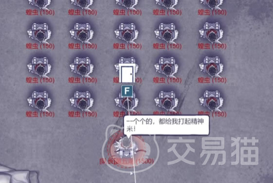 正在窃喜蝗虫很菜,结果进门后发现了一大群。这群蝗虫数量很多,由队长黄五胡统领。不过此时还不用考虑他们,门口仍然有四只步枪蝗虫,血量很高,不过射击技术比较差,游弋打法很快就能解决。开门之后就要面对满屏的蝗虫,用普通武器就太慢了,出手很容易被围住;所以此时最好用雷管的爆炸攻击来解决,边跑边朝身后丢,两三下过去,就不剩几个了。只是队长黄五胡比较难打,并且会召唤步枪蝗虫在远处骚扰。