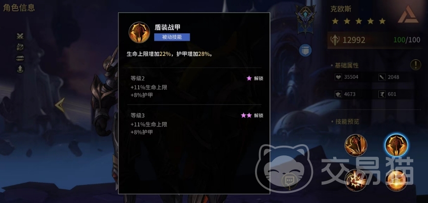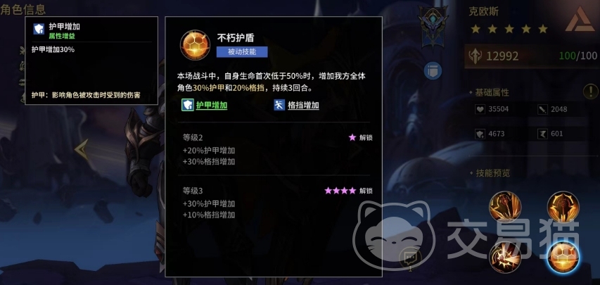 最后不朽护盾作为克欧斯的终极技能,当克欧斯的生命值首次低于50%时会触发,出发后为全队提供额外的护甲和格挡几率,持续三回合有效,这一技能的存在,让克欧斯在关键时刻能够帮助保护队伍内的重要输出角色,为团队带来一线生机,后期技能满级时可为全体队员提供高达90%的护甲增加和40%的格挡几率。