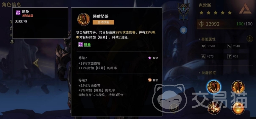 克欧斯作为一个潜力值很高的角色,实际大家使用他的时候可以通过掌握技能来搭配阵容,他的技能组合更适合成为战场上的盾牌角色,首先玩家应优先升级克欧斯的第一个主动技能陨盾坠落,它不仅能对后排敌人造成高达98%的攻击伤害,还有机会使目标眩晕两回合。