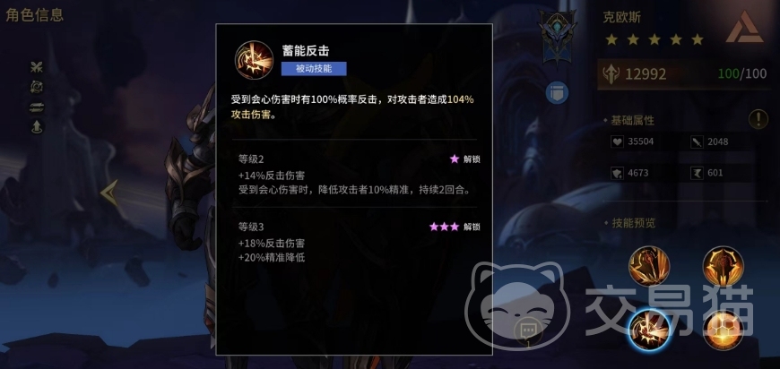 第三个技能蓄能反击作为另一项被动技能,让克欧斯在遭受会心伤害时能够进行反击,造成高达132%的伤害,并降低攻击者的精准度,有效控制住敌方的输出能力,随着技能等级的提升,反击伤害增至156%,同时精准度降低效果增至30%,持续两回合的效果,会极大增加了克欧斯的反制能力,使其在承受伤害的同时也能给予敌人沉重打击。