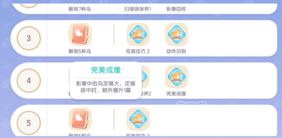 其次观鸟爱好的等级也是非常重要的,比如在到达第四级时,就会多了一个完美成像的功能,可以让你观鸟的时候额外加一个星级,大家可以看到想要额外加一星也是有要求的,这里大家最重要的是让影像足够居中,足够大是次要的哦。