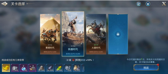 对于不同时代的关卡,难度自然也是不一样的。青铜时代相对简单一些,但到了铁器时代火器时代甚至工业时代,挑战就会越来越大。这时玩家的队伍评分就显得尤为重要了。如果玩家的队伍评分足够高,那么玩家可以尝试探索更多的地块,获取更多的资源。但如果评分稍低一些,也不要灰心丧气,玩家可以选择一条能够最大化获取增益BUFF的路线,以此来提高玩家的战斗胜率。