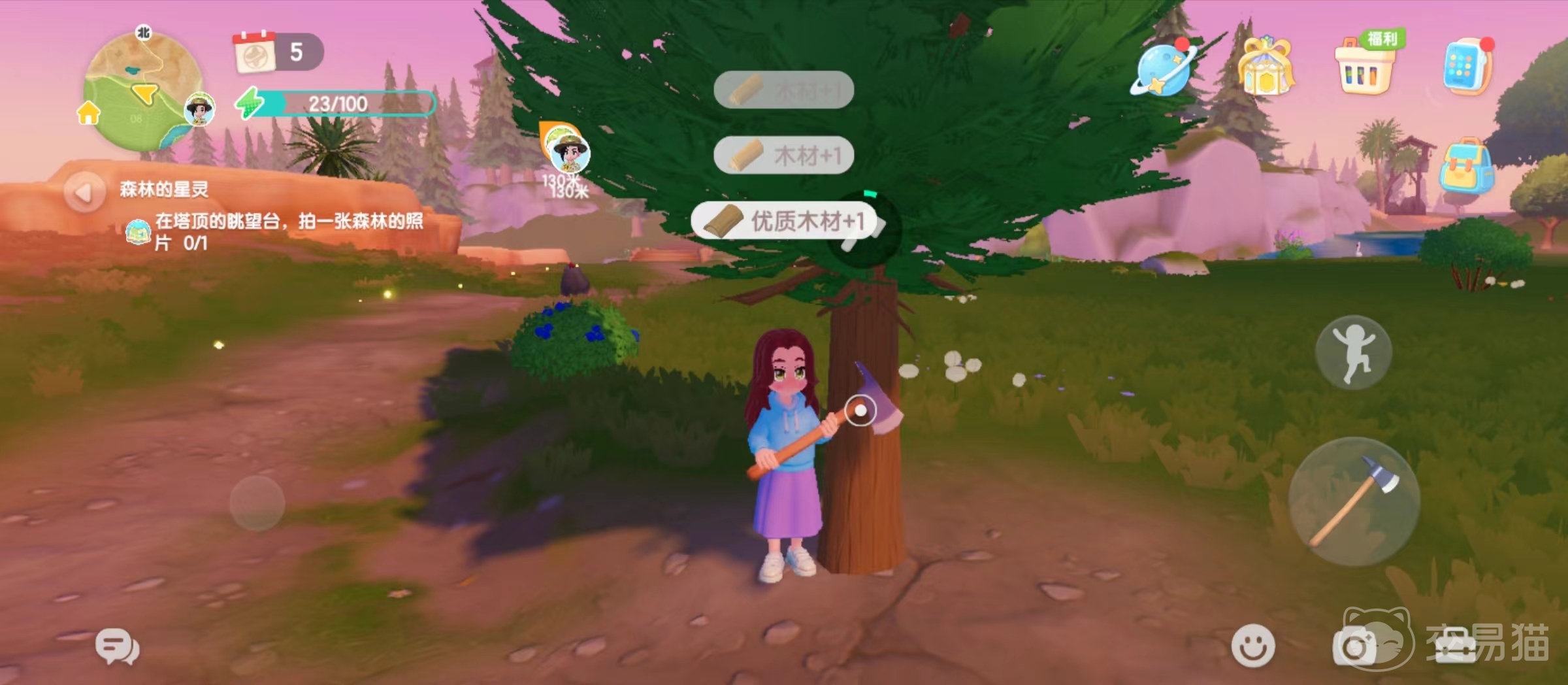 第一个点的位置在卡清的附近,从她的对面标记100米处,会看见有两颗大树,它们分别位于斜对角的位置,如果找不到卡清的小伙伴,可以在地图上查找小镇中心的边缘就能看见她啦,找到如上图所示的大树之后,工具进行斧头切换,每消耗一点体力就能获得一根优质木材,此处总共能得到六根。