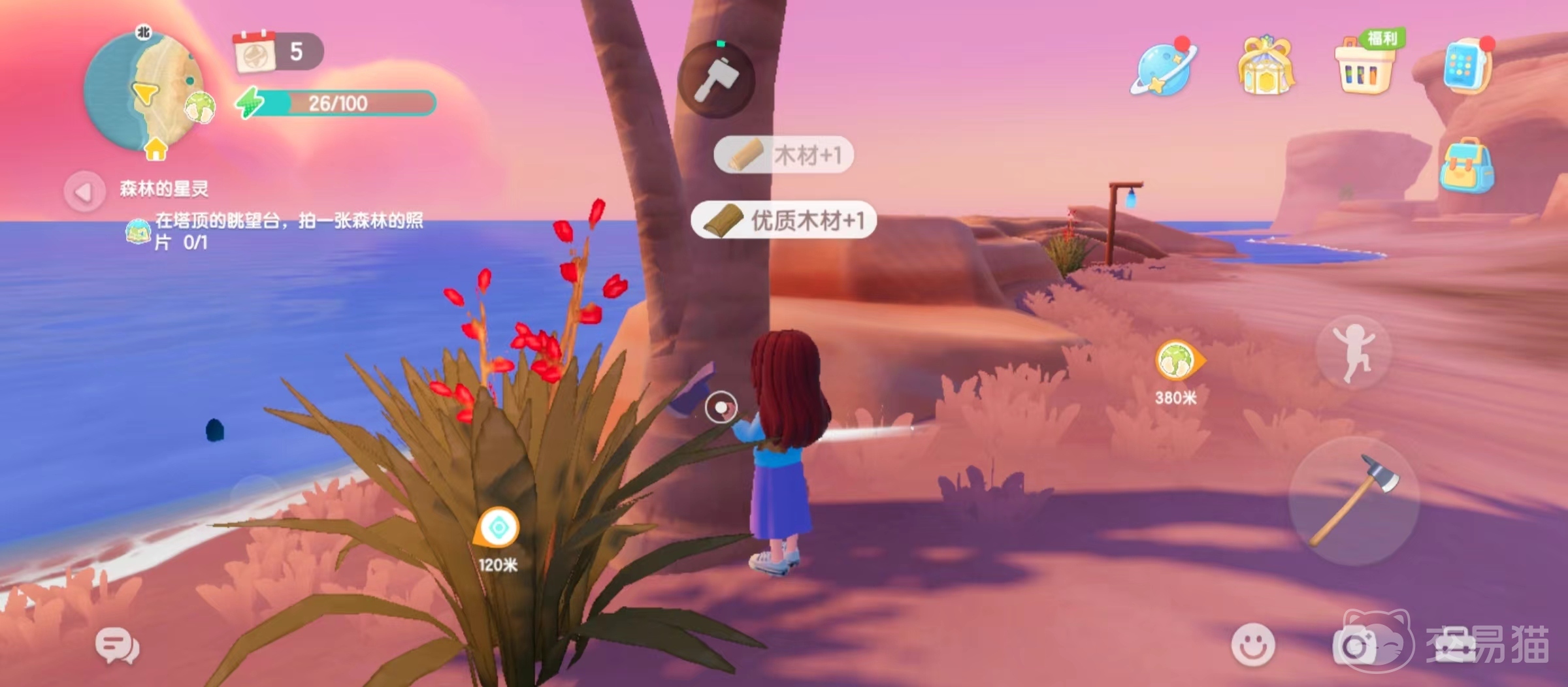 第二个点在地图上的沙漠靠海边的位置,那里有很多的椰子树,玩家可以在地图上优先进行标记,然后到标记点出找到椰树,但和上一个点相比,椰树每次砍伐只能出一根优质木材,好在这里椰树有很多,当小伙伴们需要优质木材的时候,将体力拉拉满就能够来沙漠砍树啦。