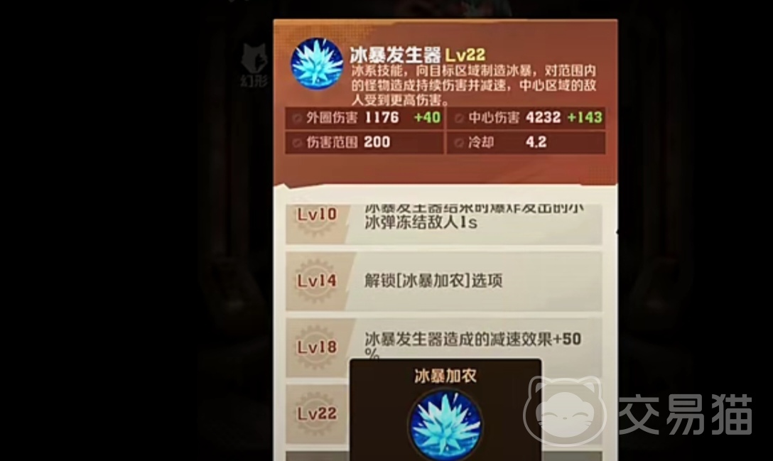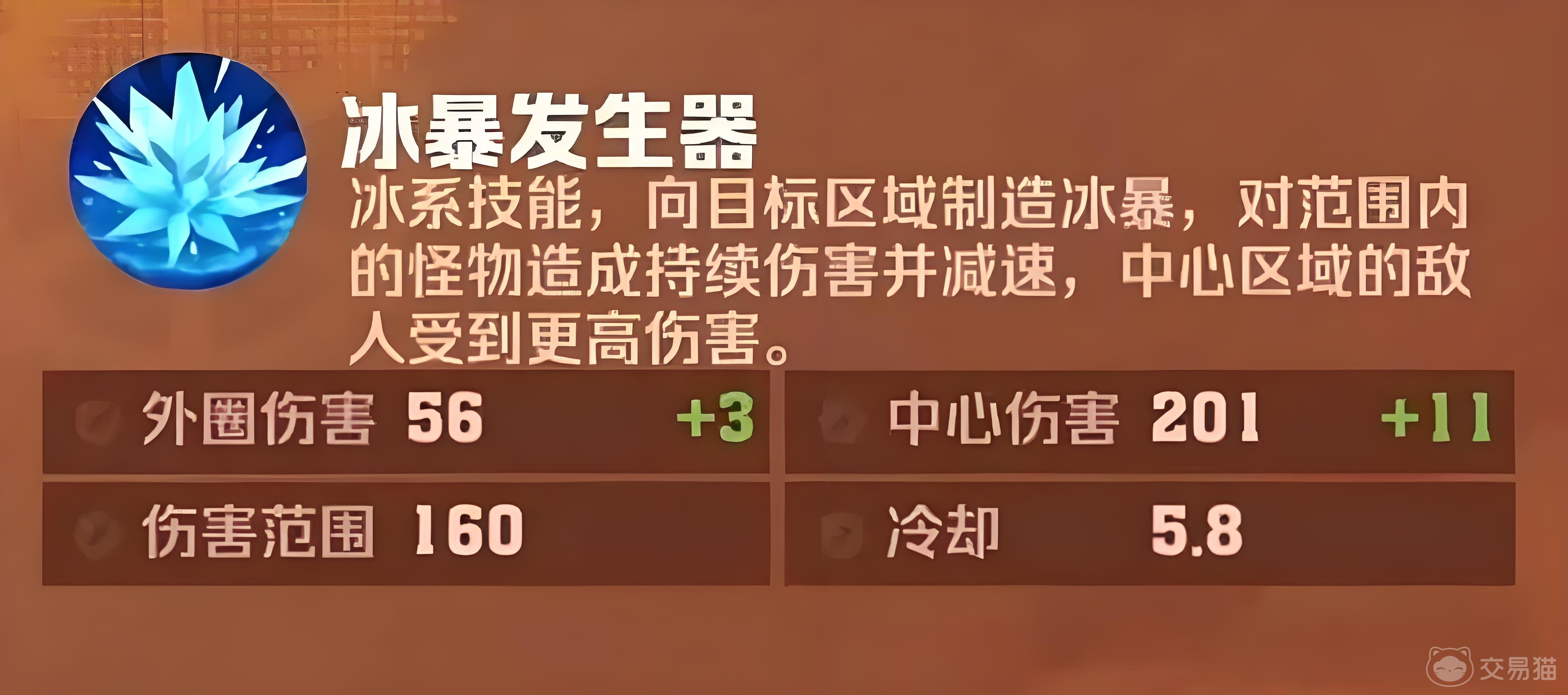 冰暴发生器是一种属于冰系的技能,玩家在把攻击目标锁定以后释放这个技能可以造成大范围的冰暴,敌人被击中后不仅会被该技能持续伤害,同时该技能还会给敌人附带减速的效果,在攻击目标区域中心位置的敌人所受到的伤害要要比其他位置受到的伤害更高。