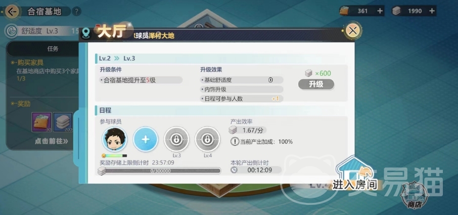 基地升级也可以提升一定时间段建筑的产出,在主界面中大家可以确认合宿基地等级,达到一定条件之后,就可以消耗基地水泥升级基地,基地升级之后,舒适度将提升,这形成一个升级的闭环,在基地当中大家可以在特定房间中派遣球员参与日程安排,这样就会有奖励,房间等级越高,能够派遣的球员数量越多,获得的奖励也更加丰厚。