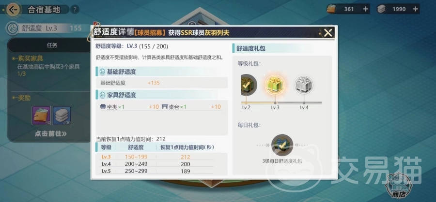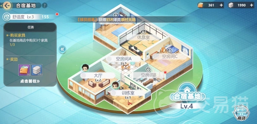 合宿基地是有基地任务的,大家进入基地页面在左边就可以看到当前的任务,完成基地任务可以获得基地经费和建筑水泥,建筑水泥就可以提升基地建筑的等级。想要布置这个基地就需要了解编辑的玩法,在编辑模式中,可以将购买的家具摆放到场景中,只要是绿色就可以安放,如果是红色说明位置不对,就需要挪位子,舒适度数值就是其中最重要的一个数值,只要大家获得家具即可大幅提升舒适度,这个家具是可以在基地商店中购买的。