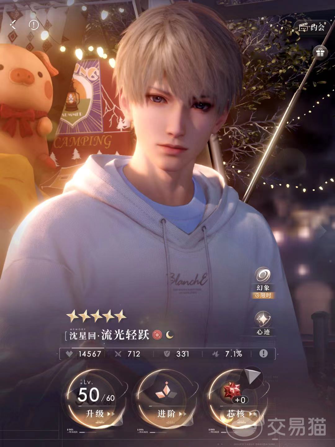 第一张叫做【流光轻跃】为五星红色月卡,流光轻跃的天赋为在超过8000生命之后,每增加400点生命,就会增加队伍虚弱增伤0.2%。流光轻跃的约会发生在玩家和沈星回的一次团建活动当中。在猎人先遣组连续周转了一个月之后,队长终于为大家组织了一次团建露营活动,而沈星回也在其中。两个人的甜蜜故事就此展开,