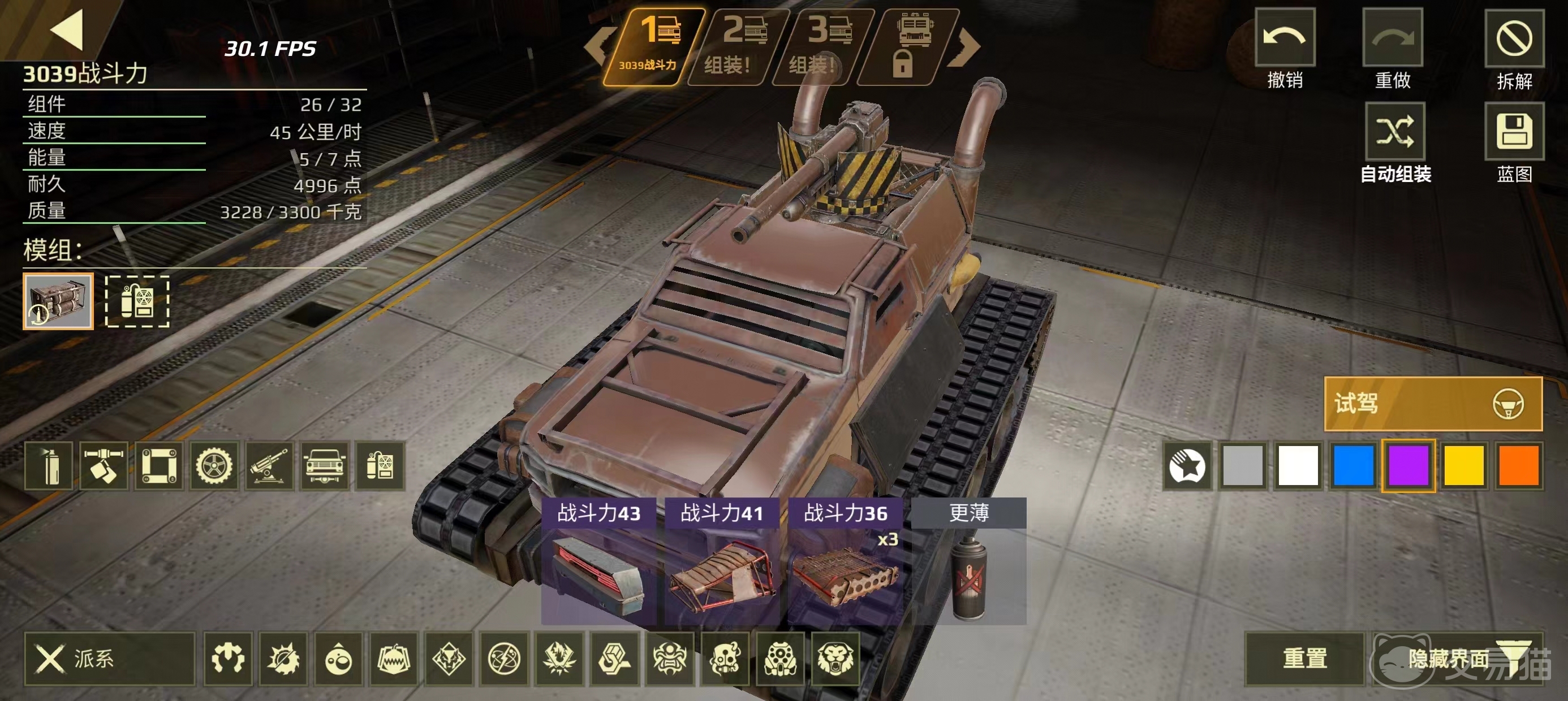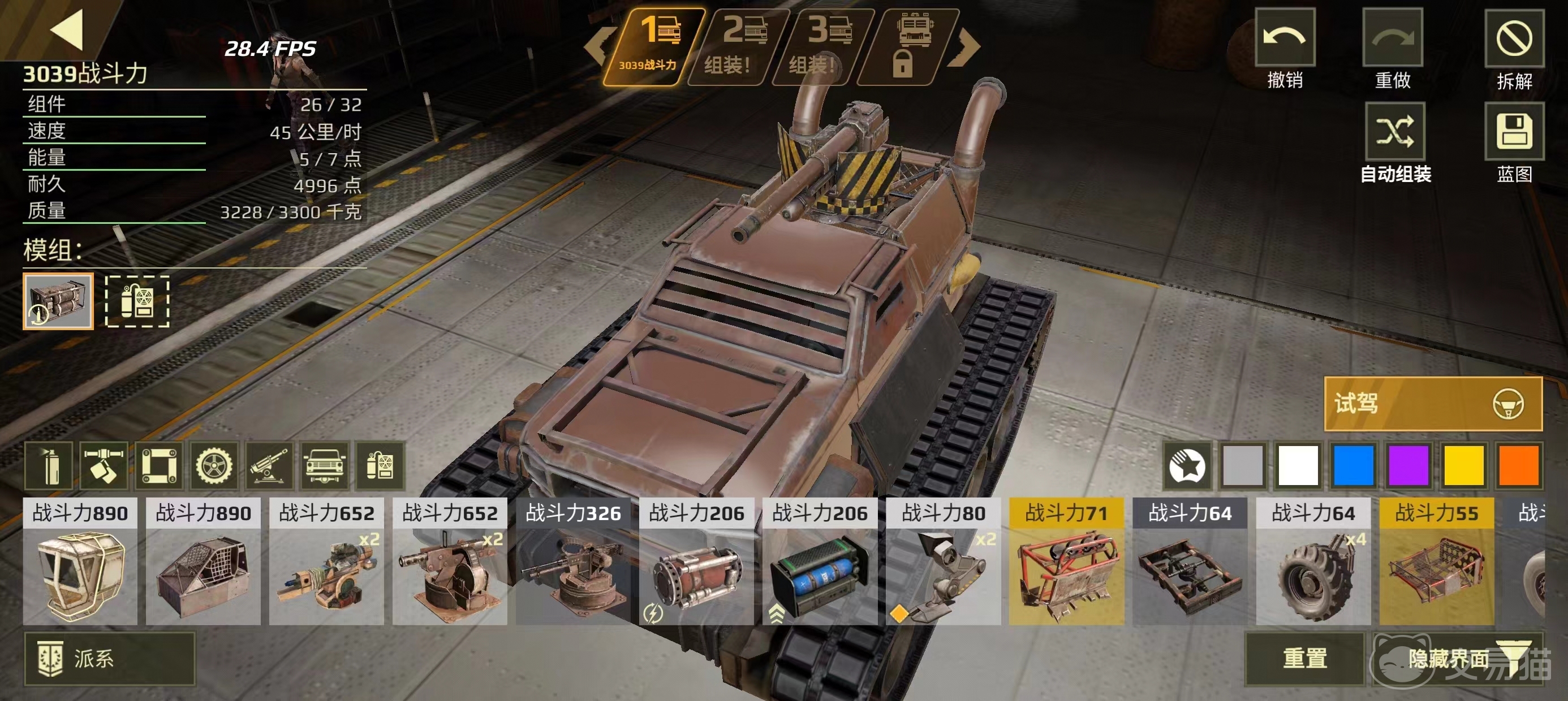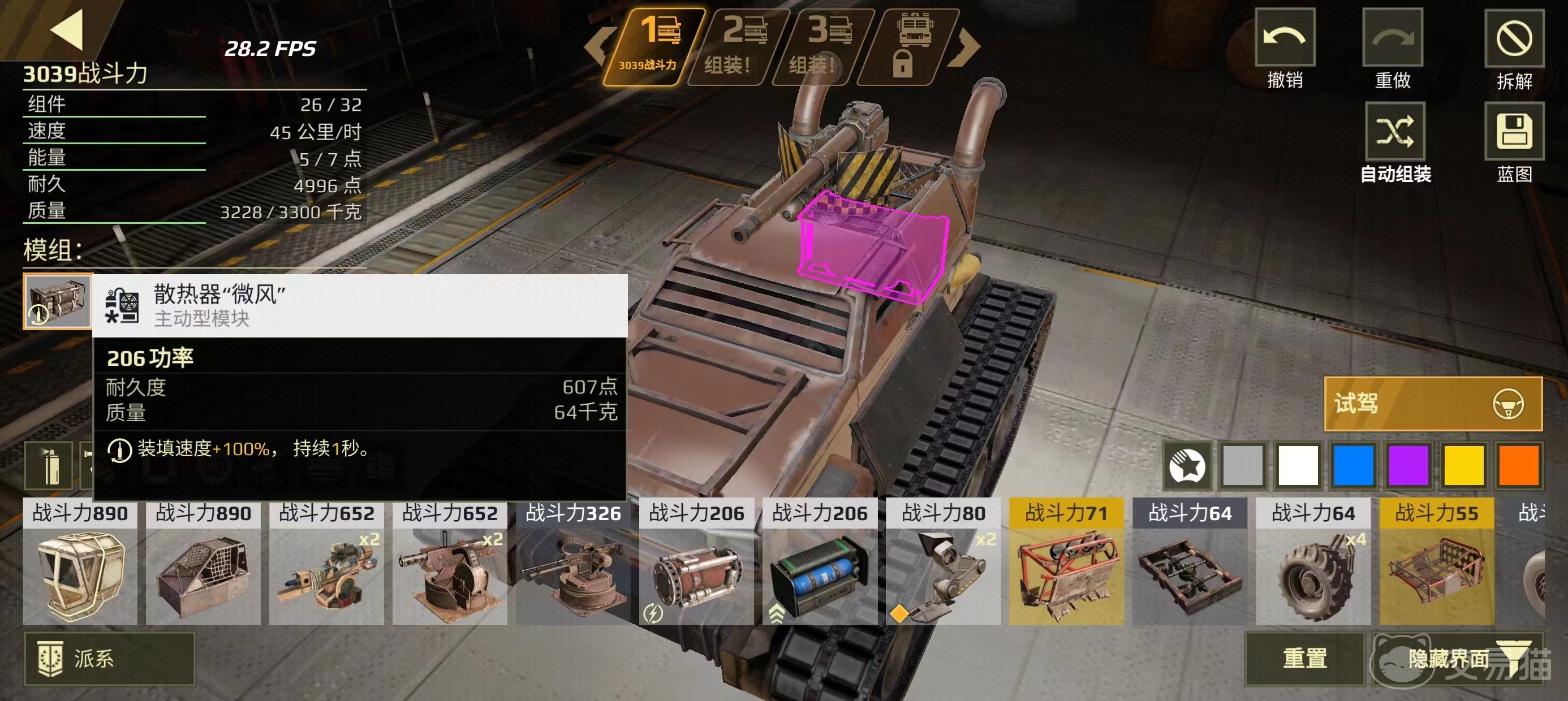 完成上面这两项搭建后,玩家就进一步挑选战车运行所需的其他关键配件,如发动机、油箱或电机,在游戏中这些配件种类多且效果不一,玩家需要考虑它们的大小、动力输出等因素,所有这些信息都可以在数据模块的数据面板中找到,在装配时参考,大家还需要考虑到最后整体战车的重量哦,灵活的战车重量一定不能太高。
