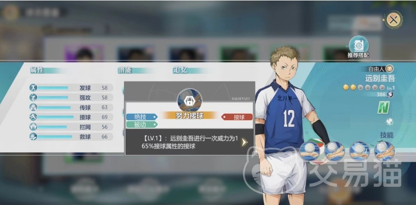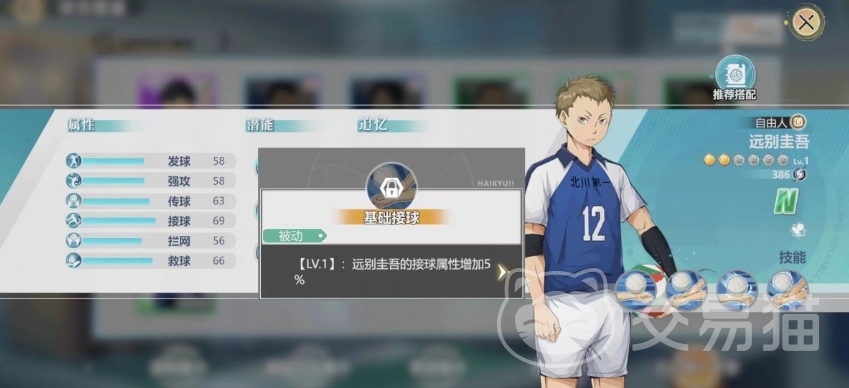 此外潜能上面使用助攻接球套装效果可以增强他的接球能力,2件套为他增加了15%的接球属性,而4件套则提供了每当自身接球结果为高分数时,我方下次扣球的威力将增加,增加值高达扣球属性的30%,另一套装效果,在自身接球时若对方采用快攻扣球,这次接球的威力将额外增加,增加值为接球属性的3n%,这使得远别圭吾在对阵快攻对手时会有一些克制效果,