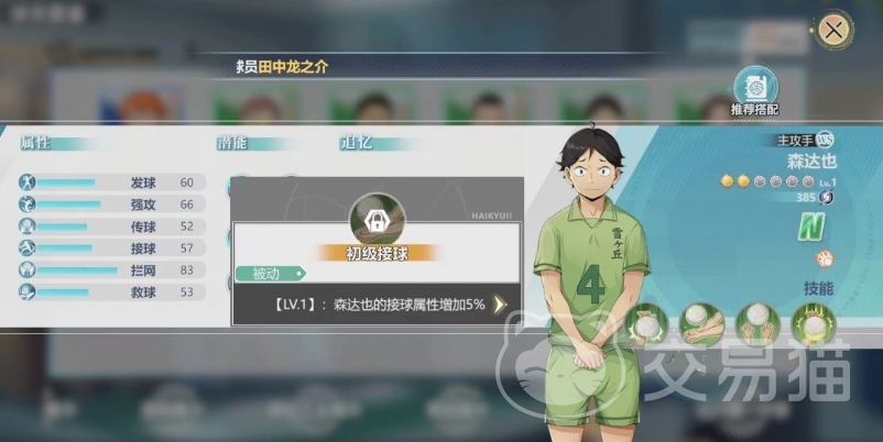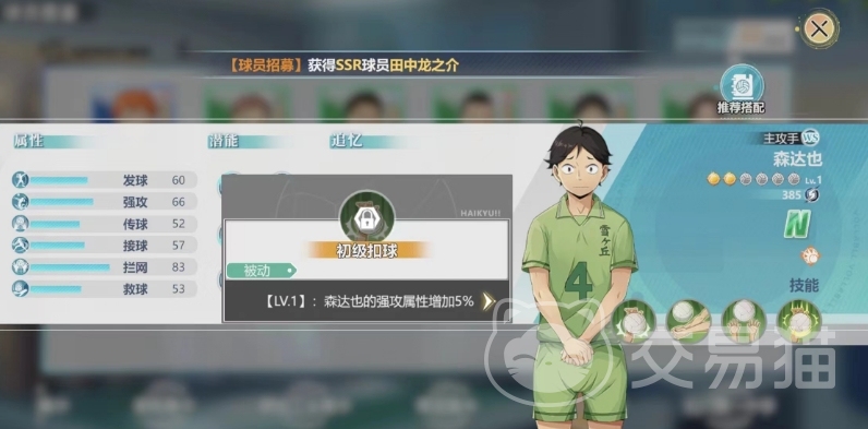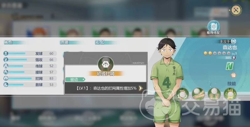 森达也作为球场上的一个N级主攻手,他的表现其实是比较符合N级球员效果的,他的技能也是主要作为一个主攻使用的,首先他的第一被动技能初级扣球,使他的强攻属性得到了5%的提升,这意味着每当森达也挥臂扣球时,对手的拦网不一定能够挡住,紧接着第二个被动技能初级接球同样提升了5%的接球属性,所以森达也在防守的时候也是有一定潜力的,