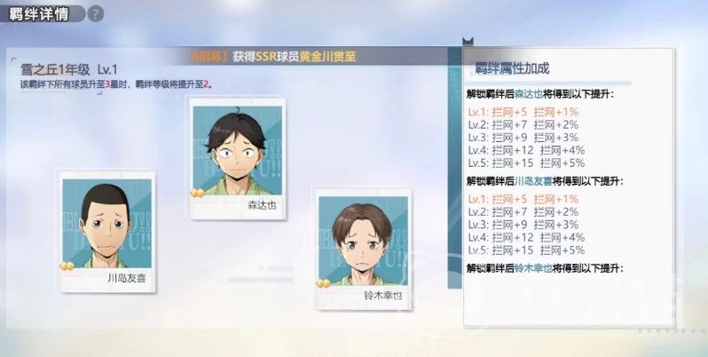 在阵容上面可以一起搭配使用川岛友喜和铃木幸也的能力,只要这三个成员在同一个队伍,且一起上阵就可以触发羁绊的效果,当这个羁绊被解锁后,他们三人的拦网能力均获得显著提升,森达也在羁绊等级提升至2时,拦网能力会增加额外的7点,同时拦网属性增加2%,随着羁绊等级的提高,这些增幅还会进一步提升,最终在羁绊等级5时达到拦网+15和拦网属性+5%的数值。