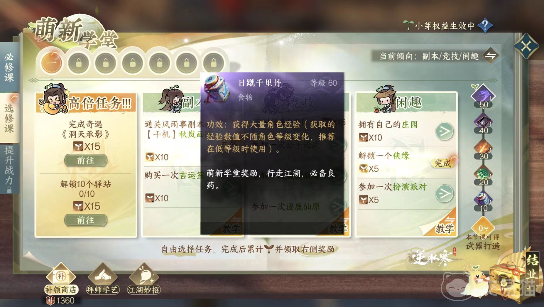 然后在萌新学堂中去完成必修课,同样需要半小时的时间,就能够获取到经验丹,使用后直接升到63级。后续选修课中还有很多内容,完成这些内容后,大家就可以直升70级,这样就能赶上老玩家的进度了。同时在萌新学堂中还有海量奖励,包括上赛季的装备,武学特质技能等,帮助新手玩家快速入门。