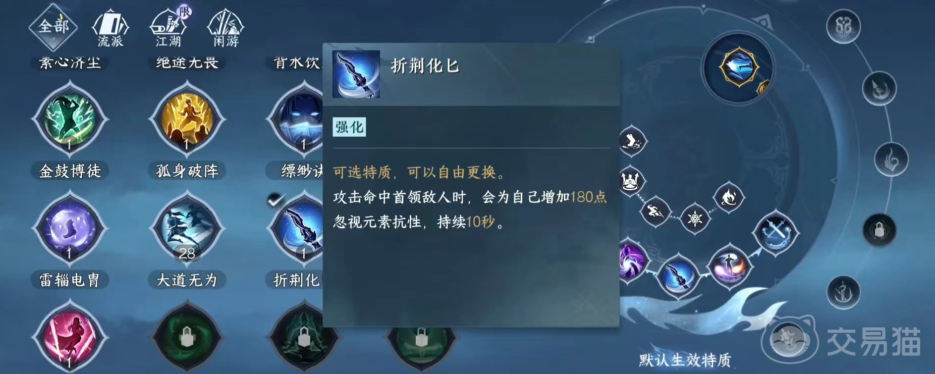 折荆化匕是属于可选特制之一,能够自由更换,在攻击命中首领敌人时,为自身增加180点忽视元素抗性的效果,持续10秒钟。应该说这是一个比较普遍的特质,各个职业都可以融入进去,因为忽视元素抗性对于每个职业提高输出都是有帮助的,是否要使用还要根据自身目前的流派来定。