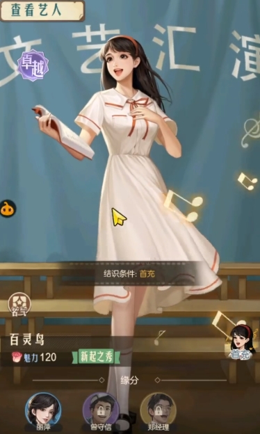 在艺人这个板块中,可以将艺人分为时尚、优秀、卓越、珍贵这几个类别。普通和优秀级别的艺人人才比较容易获得,一旦达到了卓越和珍贵级别的艺人人才就比较难获得了。作为珍贵级别的【百灵鸟】更是只能通过充值来获得,只要完成首充即可获得。