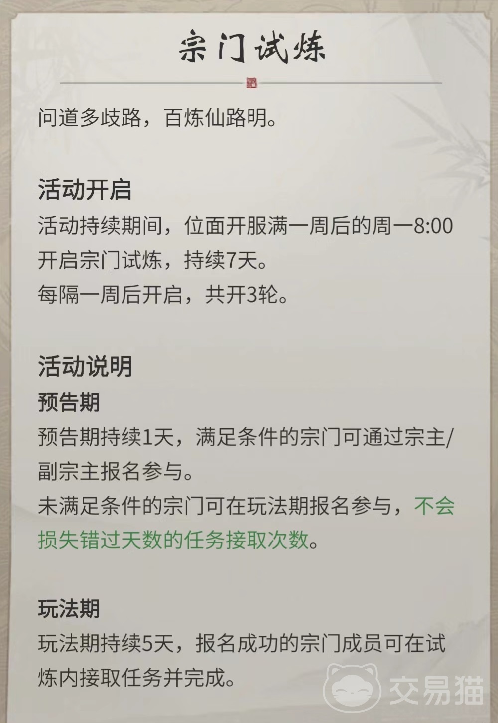 玩法的流程很简单,首先是报名参与,10人以上的宗门都可以通过宗主或副宗主报名参加,成员可以提前沟通,好做好准备。第2项是接取任务,报名成功之后,宗门所有成员都在同一个列表中接取任务,完成之后获得试炼点和个人积分,其中试炼点用于商店中兑换奖励,同宗玩家的个人积分可以提升宗门试炼等级。
