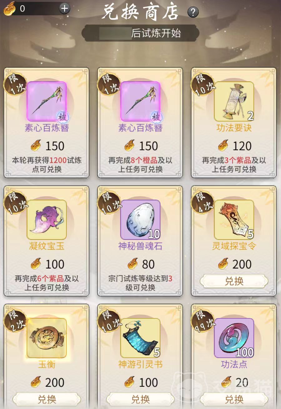 第3项,提升试炼等级,这是整个活动的关键所在,可提高高品质任务出现几率,以及任务主动刷新次数,所以试炼等级将事关大家的奖励获取和活动进展。这就展现出了活跃度高宗门的优势,所以大家一定要找一个好的宗门。所获取到的试炼点可兑换的奖励非常丰富,在相关兑换商店中,包含限定古宝和各种修炼资源等,其中有一部分奖励需要满足相应要求才可以获得。例如需要达到指定等级,需要接取指定品质的任务等,这一点要根据大家要兑换的奖励来定。