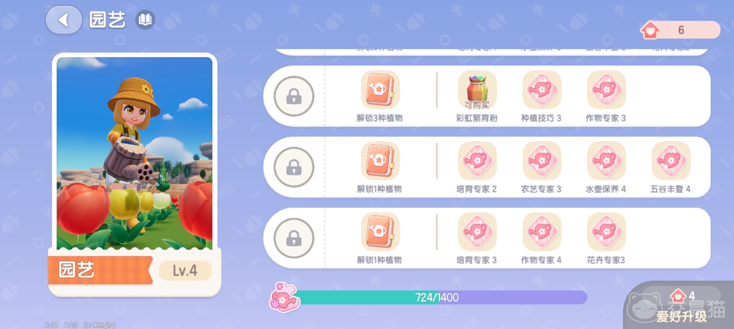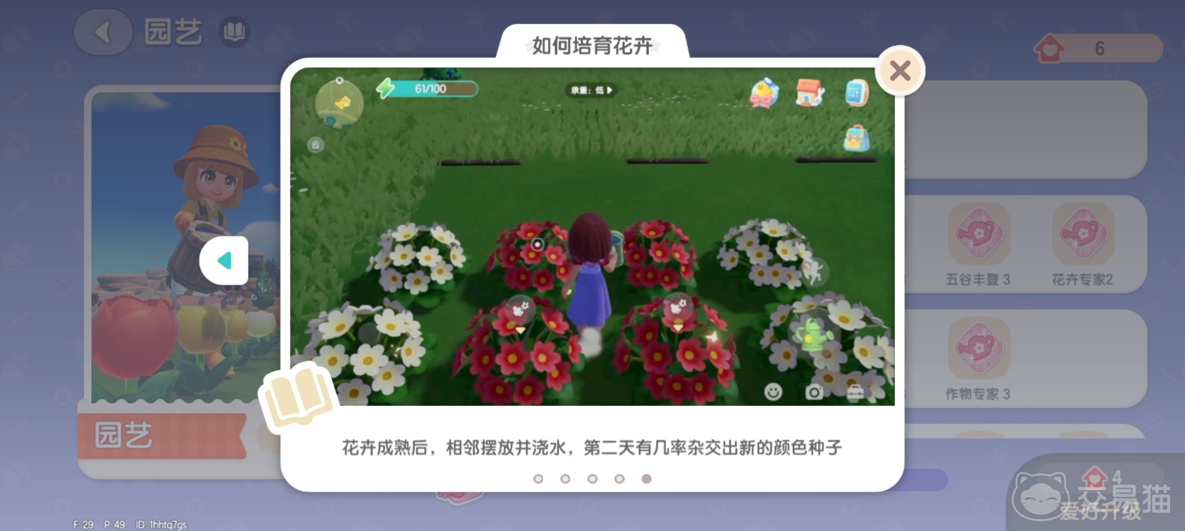 想要在游戏中种植出彩虹的话,首先就是要将园艺这项爱好升级到5级。这样就能找【布兰克】直接购买【彩虹繁育粉】了,有了繁育粉之后就能对院子里种植的五颜六色的花进行彩虹种子的繁育。不过想要将园艺升级到5级可不是一两天就能完成的,在爱好的升级上越到后面经验值卡池数值越来越高。想要种植出彩虹的话那就努力升级吧。