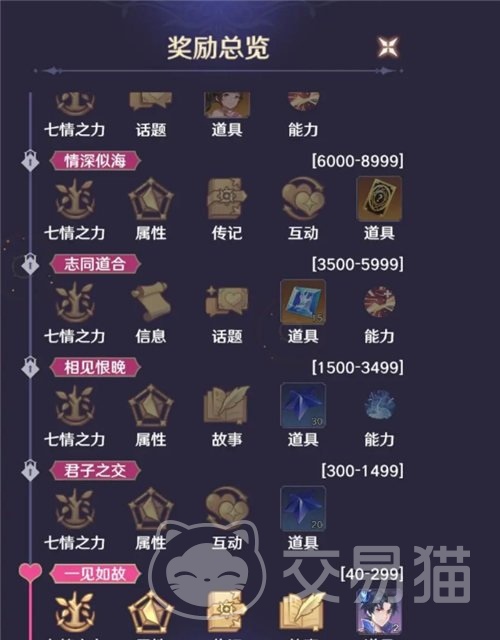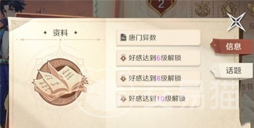 玩家们需要不断的提高他们的好感度来解锁相关的奖励体验,更有趣的互动玩法,只有在最后达到缘定三生的等级之后,才可以解锁特殊的武魂能力精通,在右侧的资料中,还有民事的相关信息以及资料等等,包含了许多的话题,后面也可以随着好感度的提升来不断的进行解锁,个人的支线剧情也会在里面,玩家们可以通过这个途径来了解他们的相关信息。