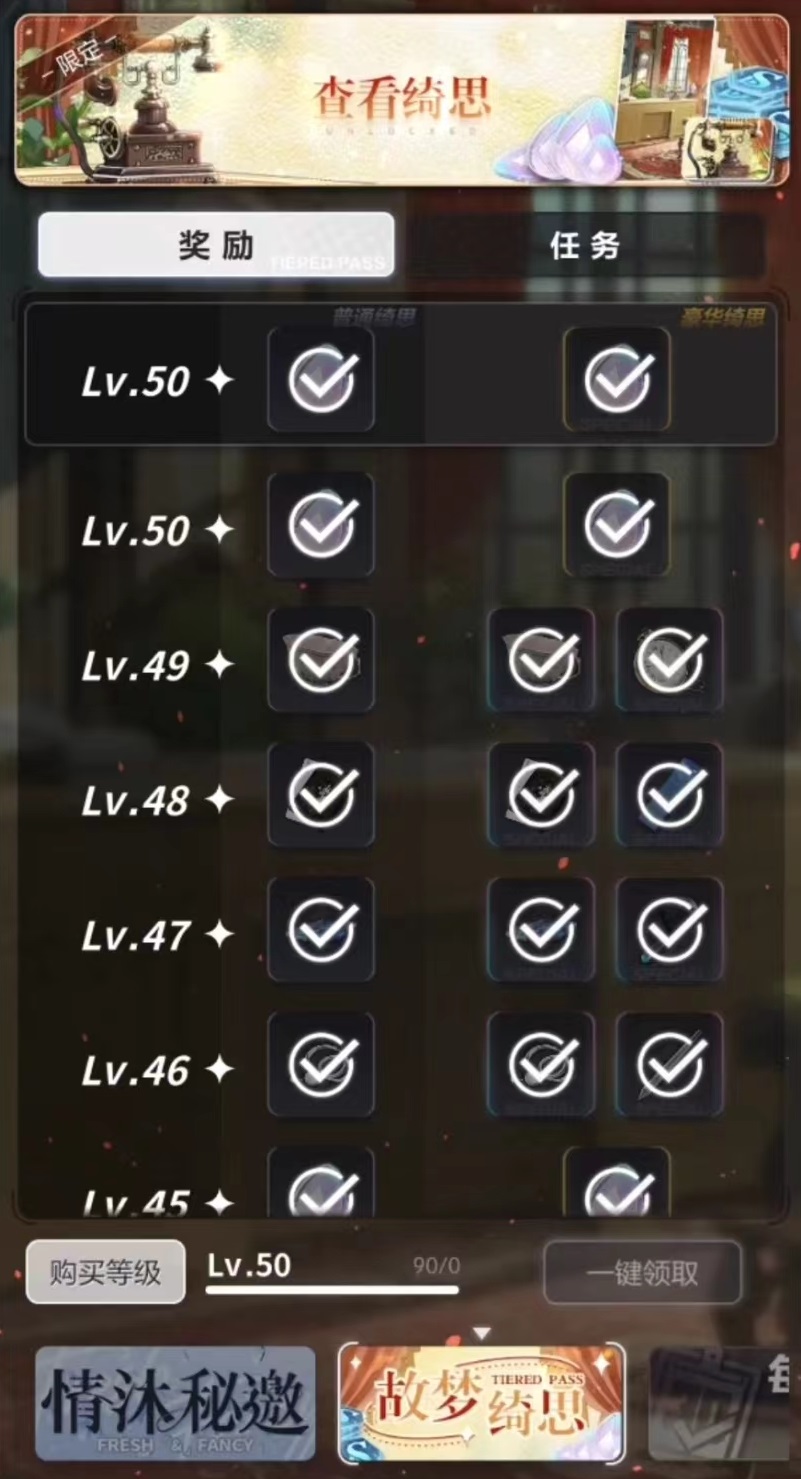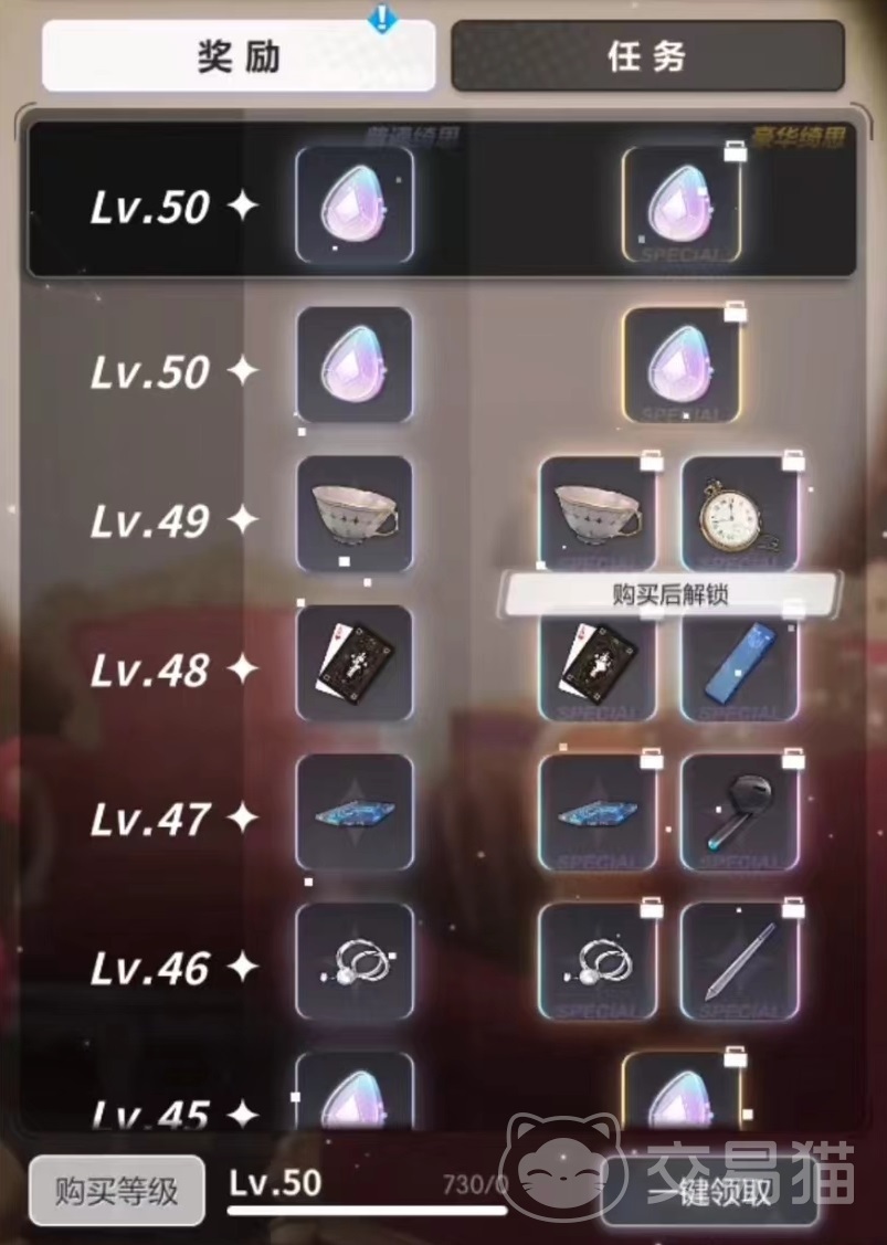 与普通相对应的就是豪华版的绮思,大家需要通过50元来解锁全部内容,在解锁后达到指定的等级,除了普通奖励之外,还有一份豪华奖励,包括上面的所有类型以及吼姆大作战等。最高档次就是花费73元购买的内容,在解锁豪华全部内容的基础上,还有额外奖励,能获得绮思馈赠,其中包括大量绮思经验,这样可以帮助快速提升等级,所以建议大家在一开始就入手。