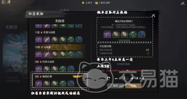 无线塔是在20级之后开启,目前最高可以刷到50层,这就是一个单人副本,按照规定每一层的boss玩家就只能刷取一次。在第1次打败boss之后还能获得首次奖励,但在挑战时没有次数的限制,只要大家有兴趣就可以一直去打。玩家在当前层级扫荡时还能得到奖励,现在每一天扫荡还会有三天的次数限制。