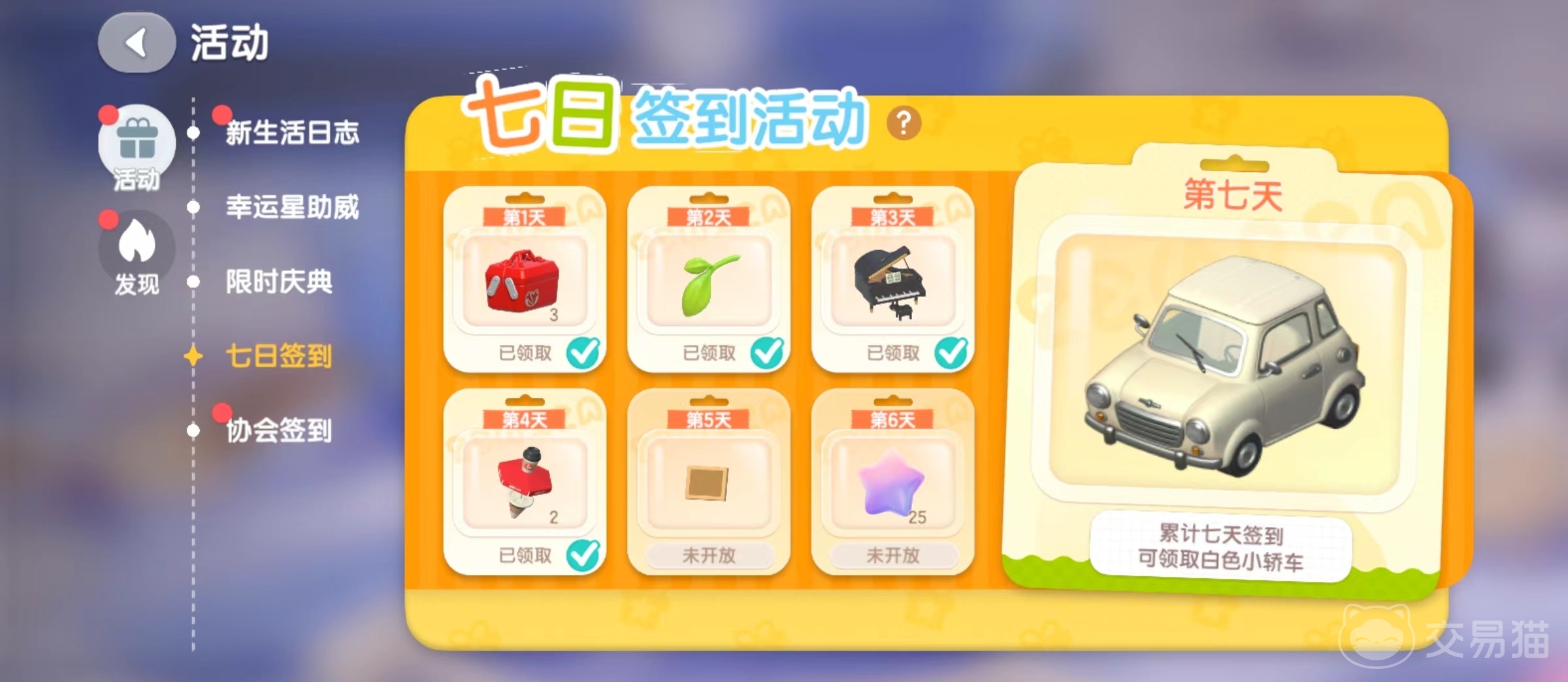这可能是所有玩家都能得到的一辆白色小汽车,而完成它的目标任务也很简单,那就是完成七日签到活动。这里小伙伴们不需要担心的是,不管是萌新还是老玩家,只要是初次登录心动小镇的,七日签到活动都是在的,没有限时情况,只要签到第七天就能白嫖到汽车啦。