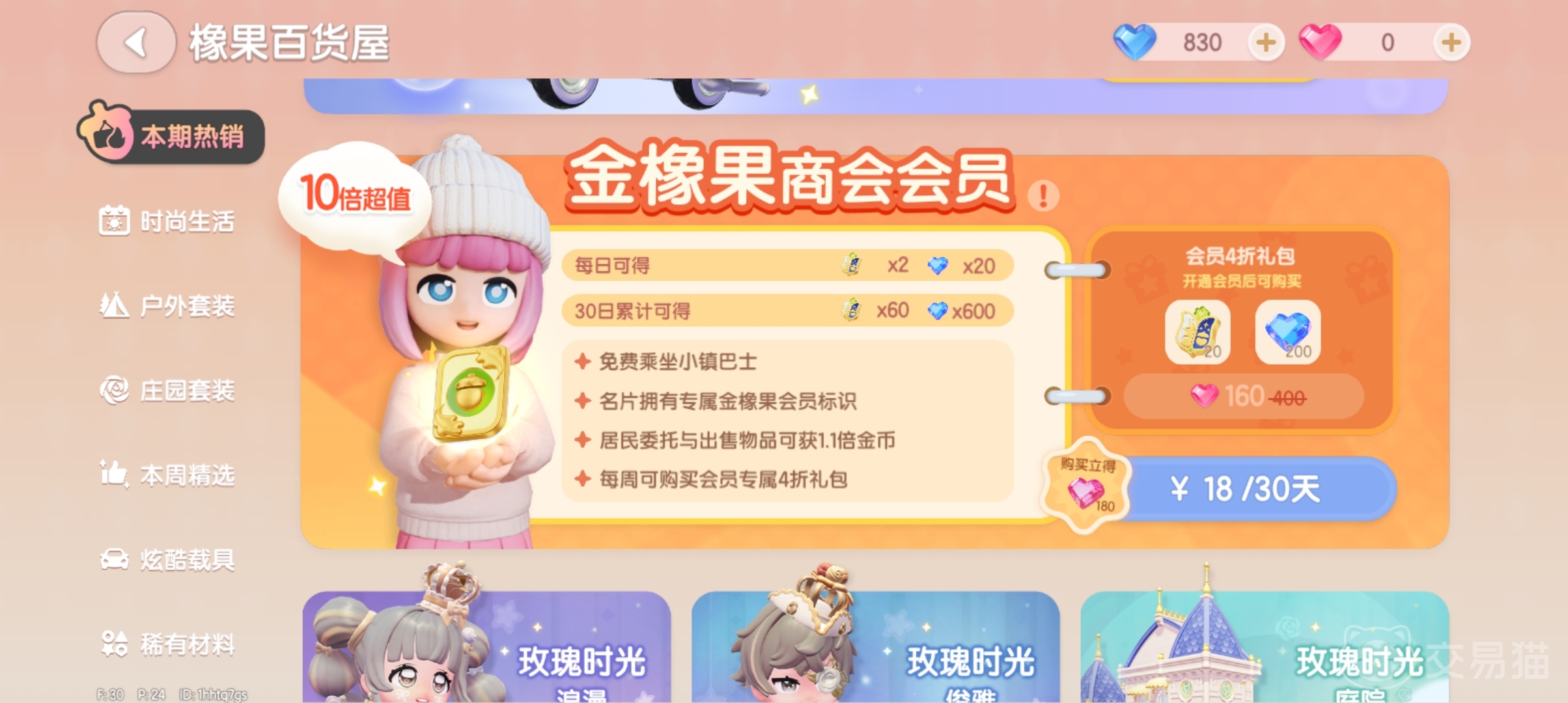 游戏中金橡果商会售价是18元30天,在成为会有后会立即获得心钻180颗。心钻可用于购买给类服饰、家具、载具等装饰道具,还能在目前还在举行的玫瑰时刻活动中抽取各类装饰道具。