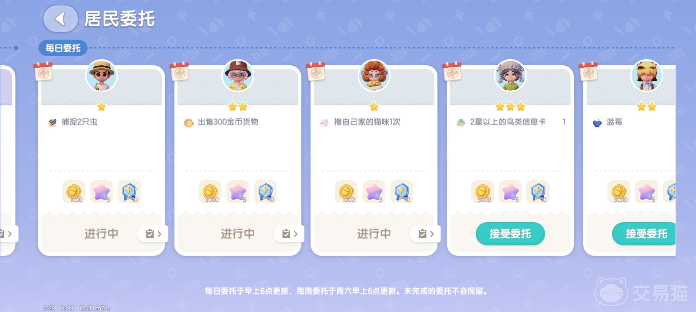 游戏中能获得贡献勋章的玩法就是完成居民的委托,居民委托任务每天只有5个且必须当天完成,超过0点就会被取消。居民任务会在每天6点更新,每周六还能找镇长领取【周委托】任务。