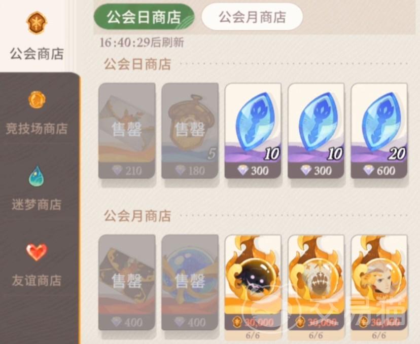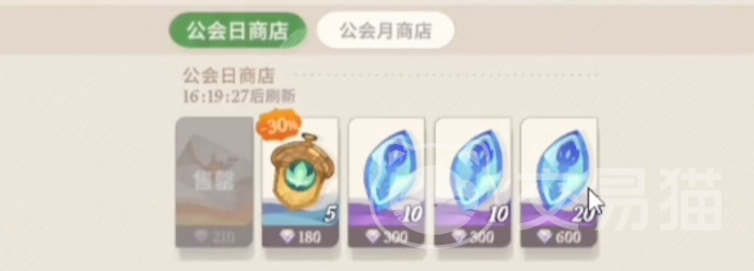 月度商店里最值得买的是打折的招募函,还有占卜水晶,需要注意这里招募函和水晶是用钻石买,而不是公会代币。公会等级越高数量上限越高,每个最多6个非常划算,建议有条件第一时间买了。至于兑换的神魔英雄,除了雷内亚(四手)别的都不建议换。