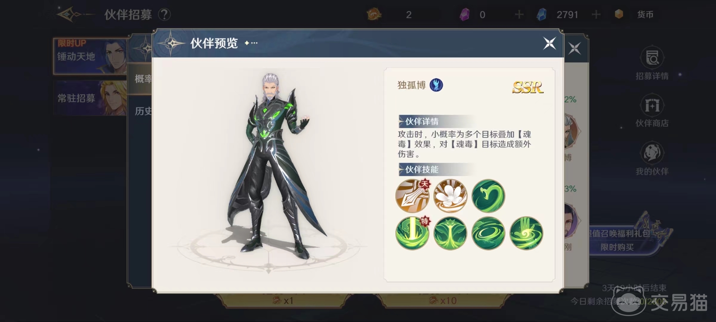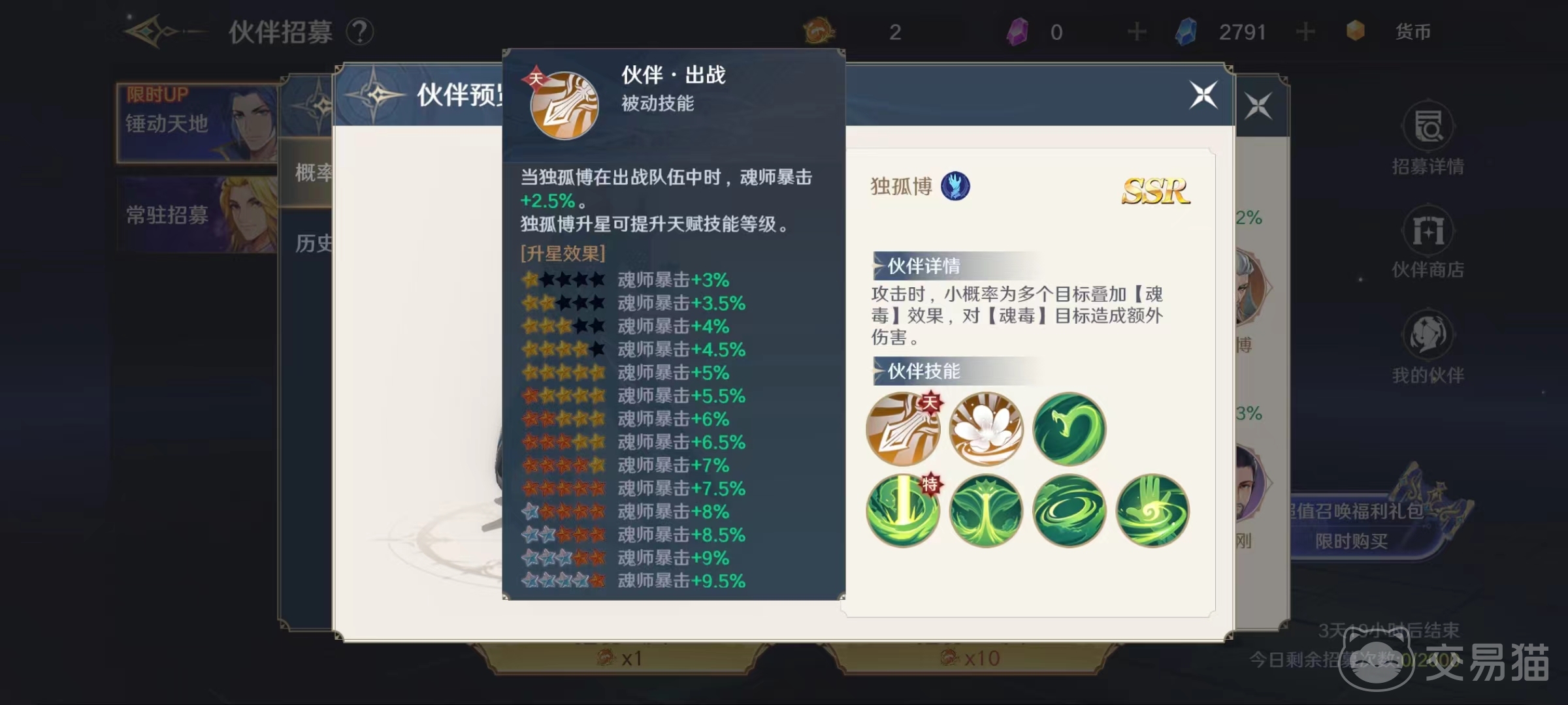 独孤博在攻击时有概率为多个目标叠加魂毒效果,对带有魂毒的目标能造成额外伤害。先来看一下它的被动技能,第1个被动技能是独孤博出战的时候,魂师暴击额外提升,达到满星时最多能增加10%。第2个被动是拥有该伙伴之后,魂师将获得防御力加成和异常状态伤害减免效果。增加的暴击对于输出来说是比较重要的,如果大家想走暴击流,可以选择独孤博出战。