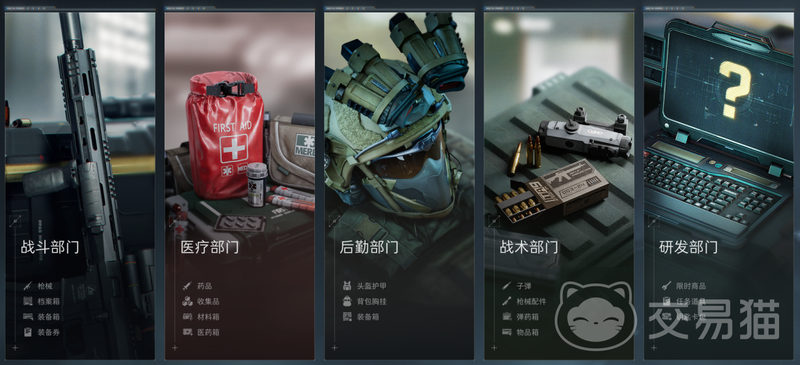 第三个战术装具,主要是背包和胸挂,这些都可以让角色能携带更多的装具,背包里面放子弹和补给物资,这是不能直接用快捷轮盘使用的,需要将背包打开至胸挂,口袋部位才可以使用;还有一些特殊的固定装具,比如门禁卡包,以及安全箱,前者存放门卡钥匙,后者放各种非武器的配件物品,即使撤离失败也还在。
