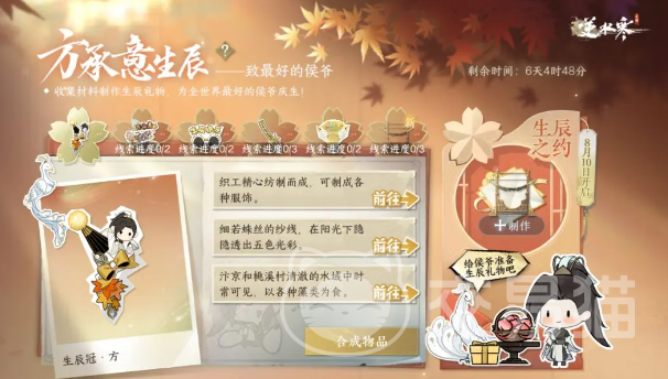 8月3号到8月16号期间,玩家还可以参与生辰活动,将任务所需的道具给合成,就能免费领取可爱的纪念外观和动作,8月18号手上持有道具乌木兰锜的玩家可以去完成任务生辰之约·方承意,没有乌木兰锜的小伙伴也可以将其他道具展示给方承意,说不定有额外惊喜。