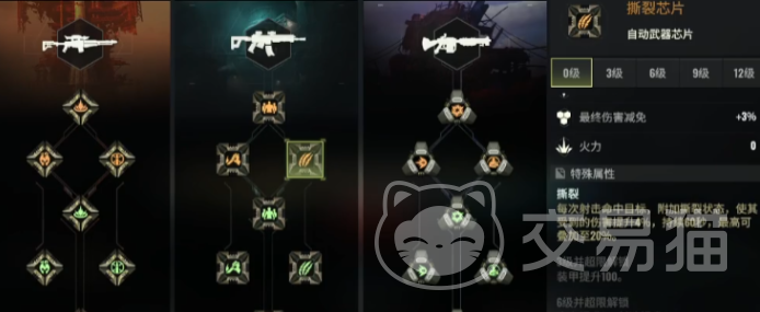 自动武器可以装备撕裂芯片和联结芯片,撕裂芯片能让命中的目标进入撕裂状态从而让其伤害提升,升级到12级后还能提升武器的射击速度,能在短时间内大幅提升伤害,联结芯片能提升队友和自身的暴击率,在升级后还能提升全属性15%。
